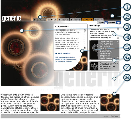 The background image for the header is the same for every page. It can be both a jpeg (.jpg) image and a flash animation (swf) [Home page options > Options and image]